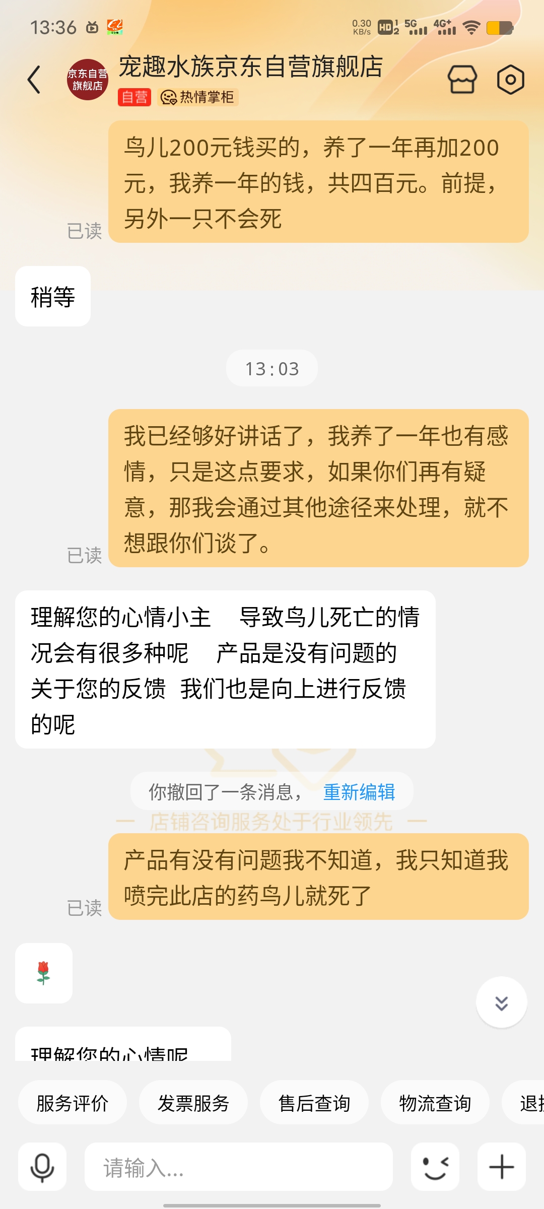 本人养虎皮鹦鹉有一年时间,看着鹦鹉身上有虫,于是于2024年4月28日在京东自营店(宠趣水族京东自营旗舰店,订单号:293082119528)购买宠易生驱虫剂;2024年4月30日早上两只鹦鹉还活蹦乱跳,中午11时左右签收杀虫剂,按店铺说明详情要求喷到鹦鹉身上后,一直鹦鹉于15分钟左右死亡,另外一只萎靡不振。后找该自营店客服进行沟通,要求其赔付400元处理,该店铺客服和京东客服敷衍拘不处理,我严重怀疑该店铺售卖药品为假冒伪劣产品,店铺为黑店,请平台相关工作人员领导为我做主,谢谢