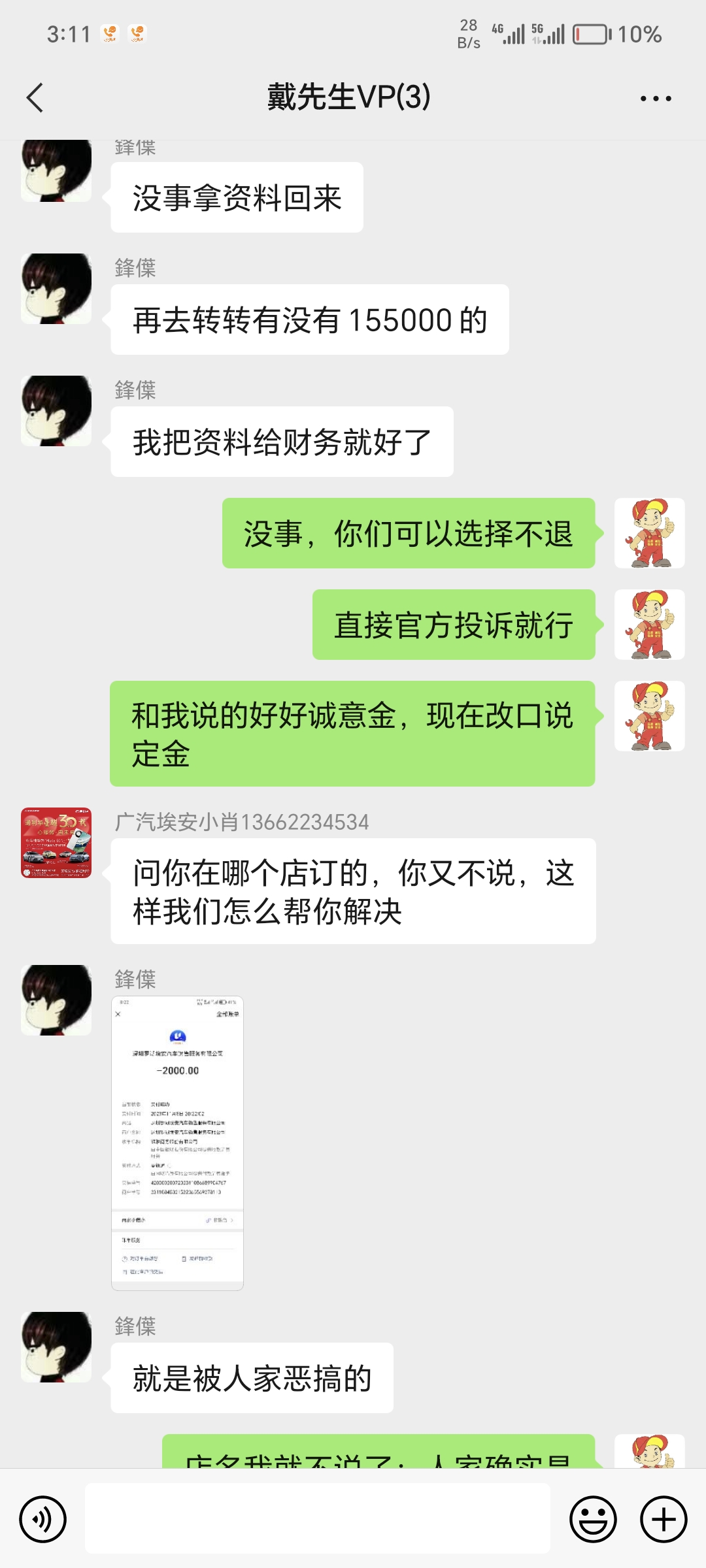 2013年11月8号下午6点左右,到罗湖区布吉检查大厦,广汽新能源深圳通利华布吉体检中心,有一位小肖的业务员接待我,我看的是一台小轿车。谈价格的时候,业务员叫我和叶剑丰经理再申请车的价格。然后去了叶剑丰经理办公室,他就转了话题既然你有这个钱,干嘛不选择SUV了。然后他带我去看一台广汽挨安AlonV,2024款Plus70星耀版。他说厂家有活动,三年十万块钱免息。我也听了这个诱惑,到时候你先交个诚意金。到时你车行不满意,不喜欢,价格问题。你随时可以退回意向金。后来听也是可以退我那2000诚意金。他就拿一个二维码给我付款,我说明天再答复你们。给我一点考虑的时间都没有,在付款当中,没有任何的收据和合同。第二天回来我说不想要了,他就跟我说你扫的二维码,现在已转向定金,退不了。你这个不是欺骗消费者吗?开始说诚意金,第二天你不满意随时过来找我退。希望该领导重视消费者的观念。希望退回我那2000元的诚意金!我对这次的服务非常不满意