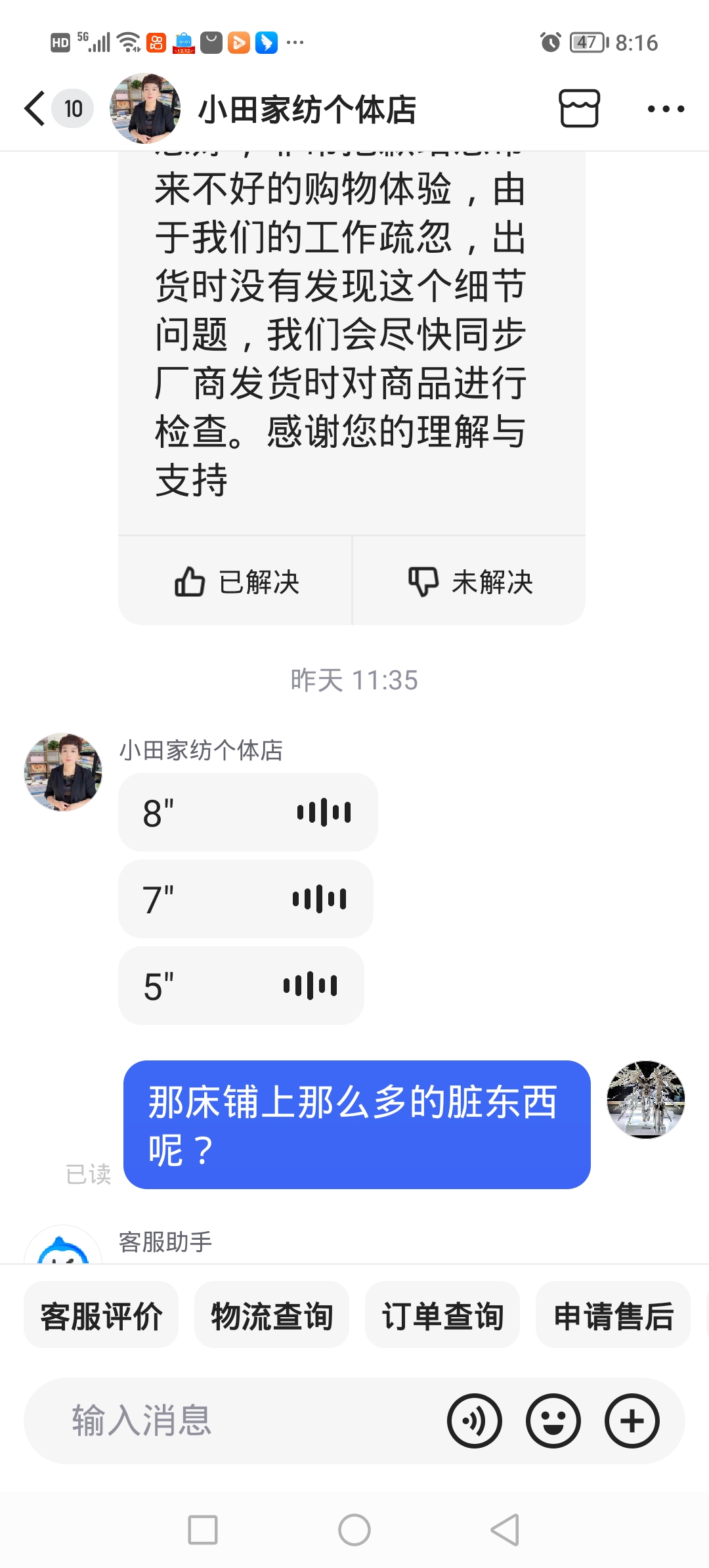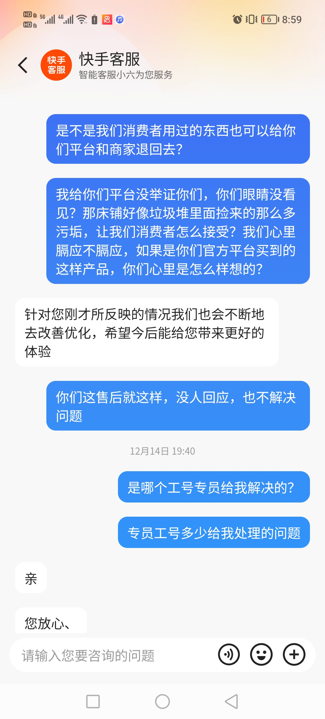 2023年12月8号在快手平台购买一单床铺,出现质量问题,产品介绍不符,床铺垫上污垢多出,而且味道刺鼻,快手平台监督管理严重出现监督管理严重问题,我在快手平台申诉无果 ,平台和商家只有利益关系,对于我们消费者平台不给公正公平处理,希望315协会给我们消费者维权,谢谢。