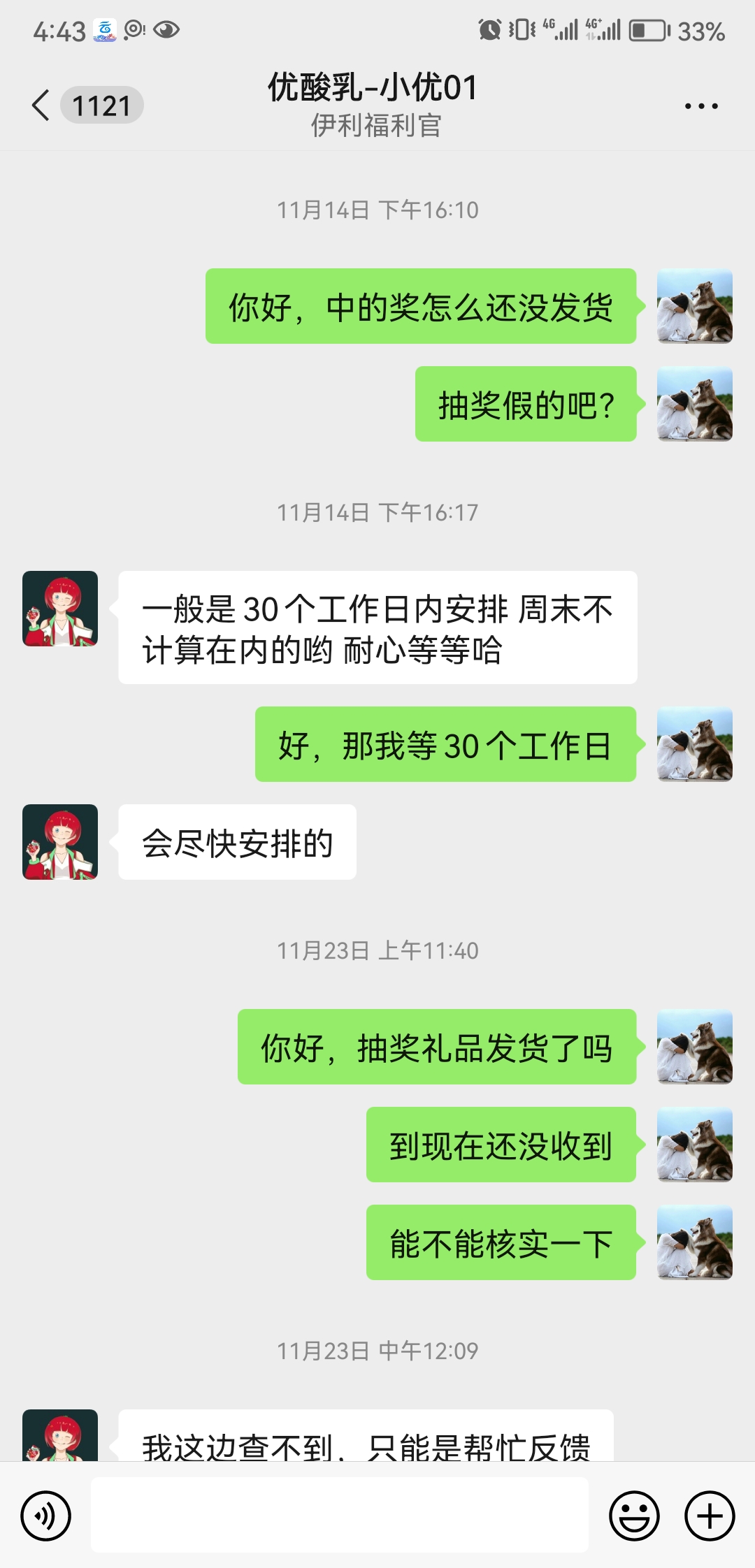 2023年10月26号参加优酸乳-小优01客服(内蒙古伊利实业集团股份有限公司)朋友圈填写问卷抽奖活动,填写完成抽奖抽到了一箱优酸乳饮料,填好收货地址,并将中奖截图发给该客服,直到今天也没有收到奖品,该客服不承认我提供中奖截图,怀疑虚假宣传活动,以抽奖为噱头,通过填写问卷获得消费者相关信息隐私等,诉求奖品发货