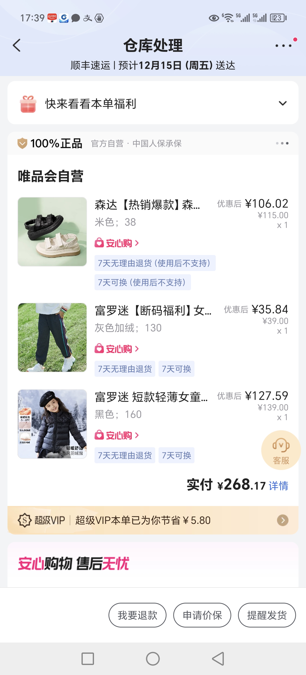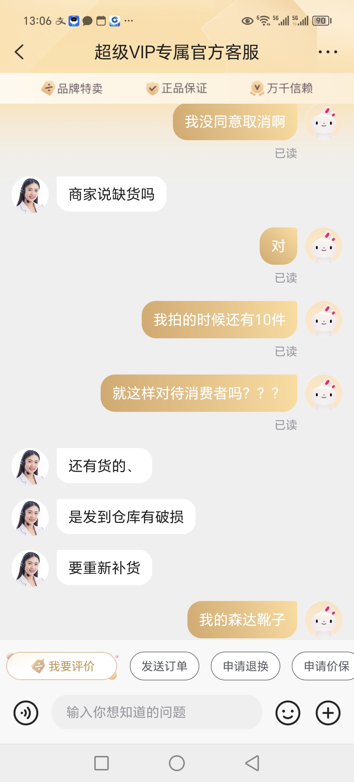 12月8日,唯品会周年庆,看到一双森达靴子加绒在降价秒杀,于是下单一双,当时库存显示还有很多,同一订单还有三件衣服,下单后两三天就可以收到货了,却迟迟等不到,下雪了我想念我的靴子,于是看了下订单显示去往发货仓途中包裹破损需要等待,那就再等等好了。又等两天还是没有消息,联系客服没人回复,12月12日回复仓库弄错库存了,让我退款,我不答应,这不浪费消费者时间嘛,而且周年庆都已经过了,商家的错误不该消费者买单吧,但客服强制取消了我的鞋,店大欺客,太欺负人了…… 我希望补发我的鞋,没货换款式也行,不需要那一点点可怜的补偿,安抚不了我受伤的心灵,希望咱平台能为消费者主持公道,谢谢!