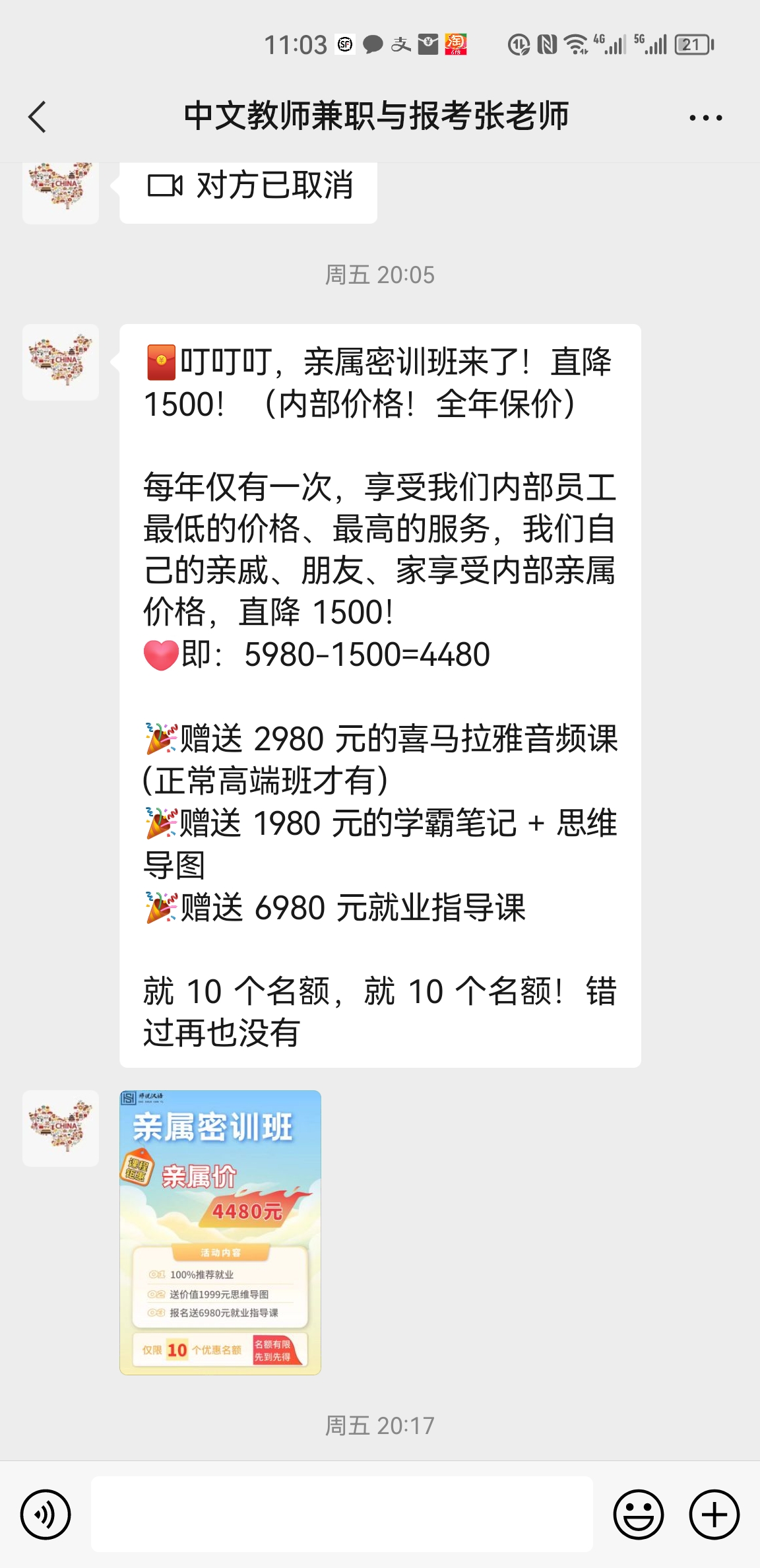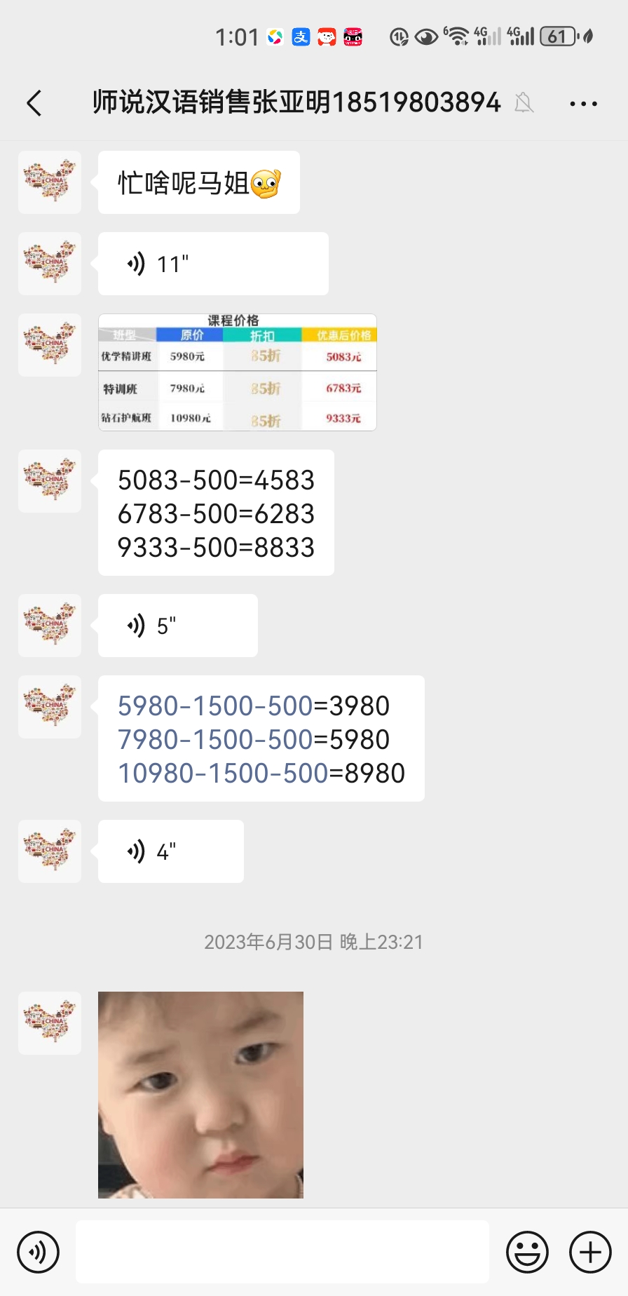 2023年7月2日在通过网上加了师说汉语的销售张亚明的微信购买了畅学精讲班。购买前销售说是内部特训价4480,实际缴费时要求先交500资格审核费,审核通过直接抵学费,最后再转3980就可以了,结果销售估计混淆视听让转了4980,总计费用5480,多收了1000元。 询培训备考《国际中文教师证》一事。师说汉语公司招生人员以虚假信息(容易过,虚假收入宣传)现在交定金500可以抢占报考名额等,每天轻松学习三四十分钟)及催促下,交了500元定金,并于次日转账4980元。发票至今没开。开课后我发现之前虚假宣传的信息很多,课程光直播时间就是一周五节,每节两小时,还需要时间背知识点和刷题,授课老师声音小,摄像头昏暗,班主任督学这项服务没有,于是我以虚假宣传反馈。我感觉商家要么是诈骗,要么存在违法违规行为,因为《国家中文教师证》是教育部颁发的证书。彻底对商家及其承诺失望。 个人诉求是希望商家退全款。