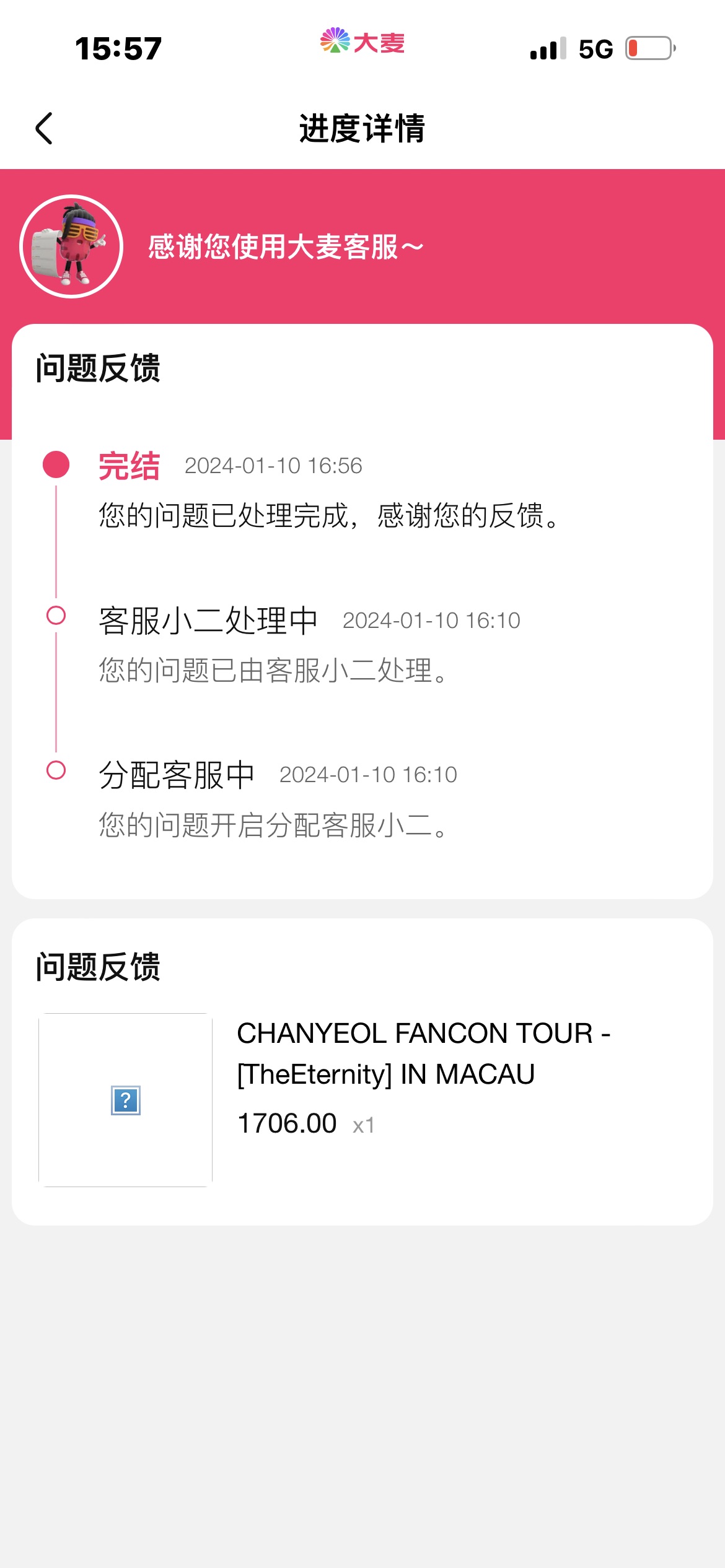 2024年1月10日,本人在线上购买大麦平台总代理的CHANYEOL FANCON TOUR -[TheEternity] IN MACAU朴灿烈澳门见面会门票,票价为1688元内场vip,后因为个人港澳通行证原因以及学业考试原因无法去澳门,于2024年1月10日下午联系大麦平台客服多次,表示无法退款,后提供帮我反馈申请退款,但反馈的结果仍然是无法退款,大麦平台在多项制度和法律中都规定,保护消费者权益,七天无理由退货的前提下,仍然存在霸王条款,屡次不给退款,提交申请反馈处理结果也是一味拖延