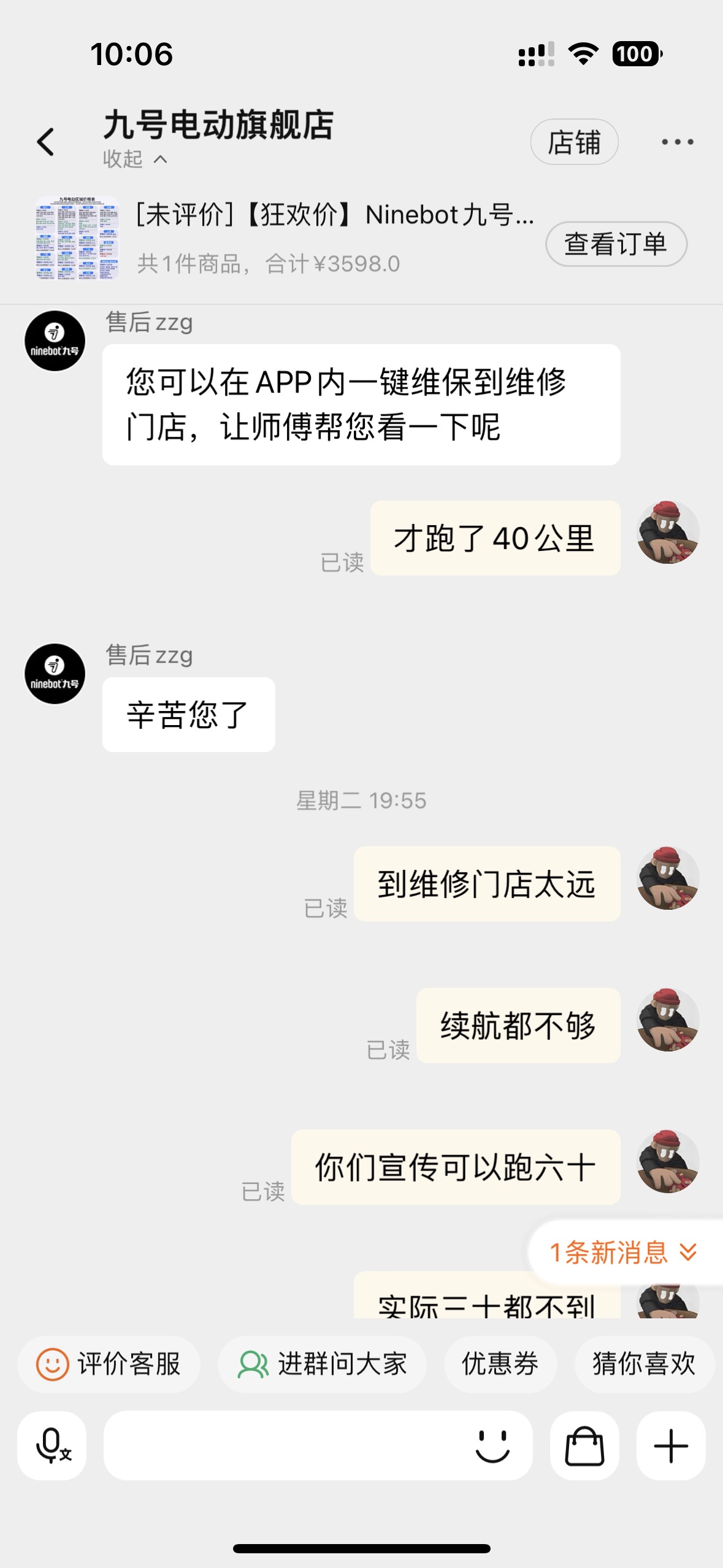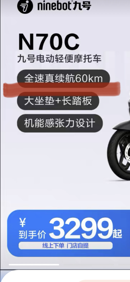 1.我于2023年11月10日,在天猫九号电动旗舰店以实际金额3235元购买了一辆型号为N70C的电动车。 2.11月11日在该公司线下门店提车,提车第二天(11月12日)充满电的情况下发现该车辆实际续航不足30km(该店铺在天猫旗舰店宣传该车辆续航60km),实际续航与宣传续航严重不符(本人骑行路段为城市铺装路段,本人体重150斤,没有载物的情况下骑行),我认为该产品虚假宣传,诱导本人下单购买。 3.该车辆还有质量问题,提车第二天,右转弯严重异响(新车体验感很差)转弯阻塞不流畅,对行驶有安全隐患。 4.我的要求售后上门检测,确认问题退货处理