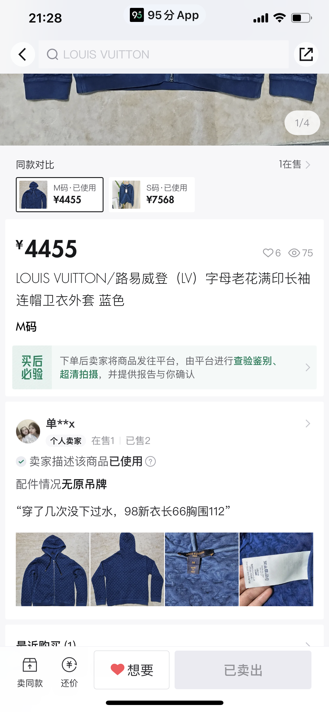 2024年5月7日我在得物旗下95分平台购买一件路易威登品牌的二手衣服4455元购买,卖家描述98新只穿了几次没有下水洗过。尺码描述衣长66(实际衣长60)胸围112(实际胸 围106),首先尺码严重不符,这么贵重的衣服尺码没有准确告知。卖家当时在95网站上只发布了四张商品图片,95分平台收到实物后进行商品检验补充商品图片12张,商品明显达不到98新的状态,并且磨损严重同时有很大的洗衣粉味道,内里磨损严重起球明显 洗涤过多次!与卖家描述的严重不符!95分平台在验货完毕,出具了验货结果与卖家描述一致的结论!然后在没有经过买家允许的情况下强制发货强买强卖并且不予退货!并且此商品领标有后期缝合明显痕迹,被二次加工过,平台和卖家都没有提前告知,平台涉嫌欺诈强买强卖。买家要求对商家欺诈和隐瞒瑕疵的行为进行惩罚并且退一赔三!平台客服强词夺理答复我说符合卖家描述标准!