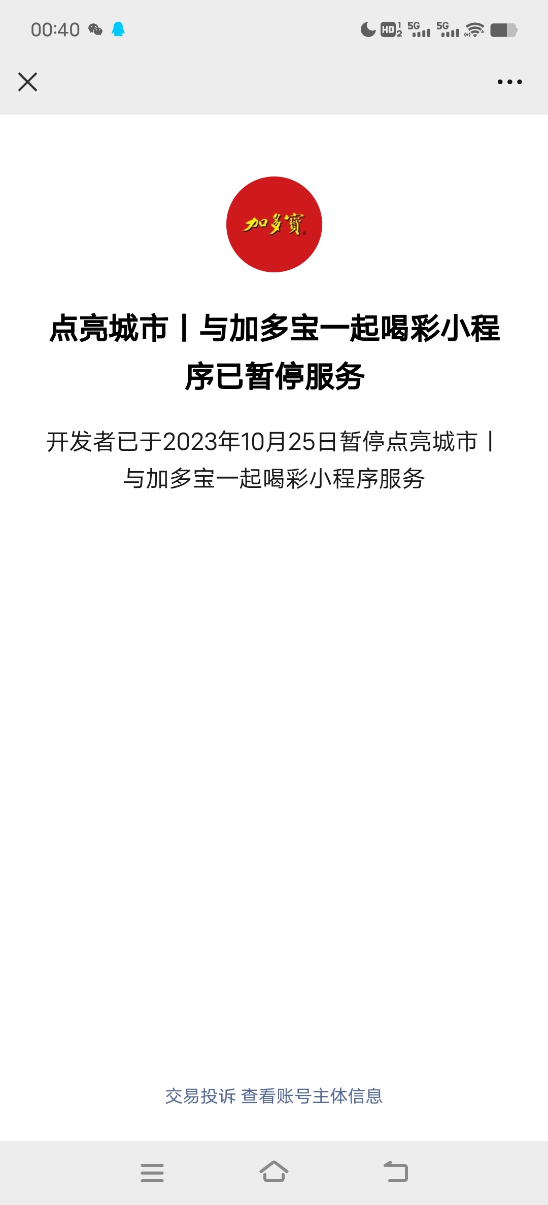 2023.10.25用账号13869705231前一直参加加多宝组织的小程序与加多宝一起喝彩活动,已经参加活动攒足了4000左右积分,加多宝在未告知情况下在10.25日私自关系该小程序,导致积分没有正常兑换礼品,联系加多宝客服,客服拖延处理问题时间,迟迟对消费者投诉问题不给明确处理,诉补发12款冰箱贴